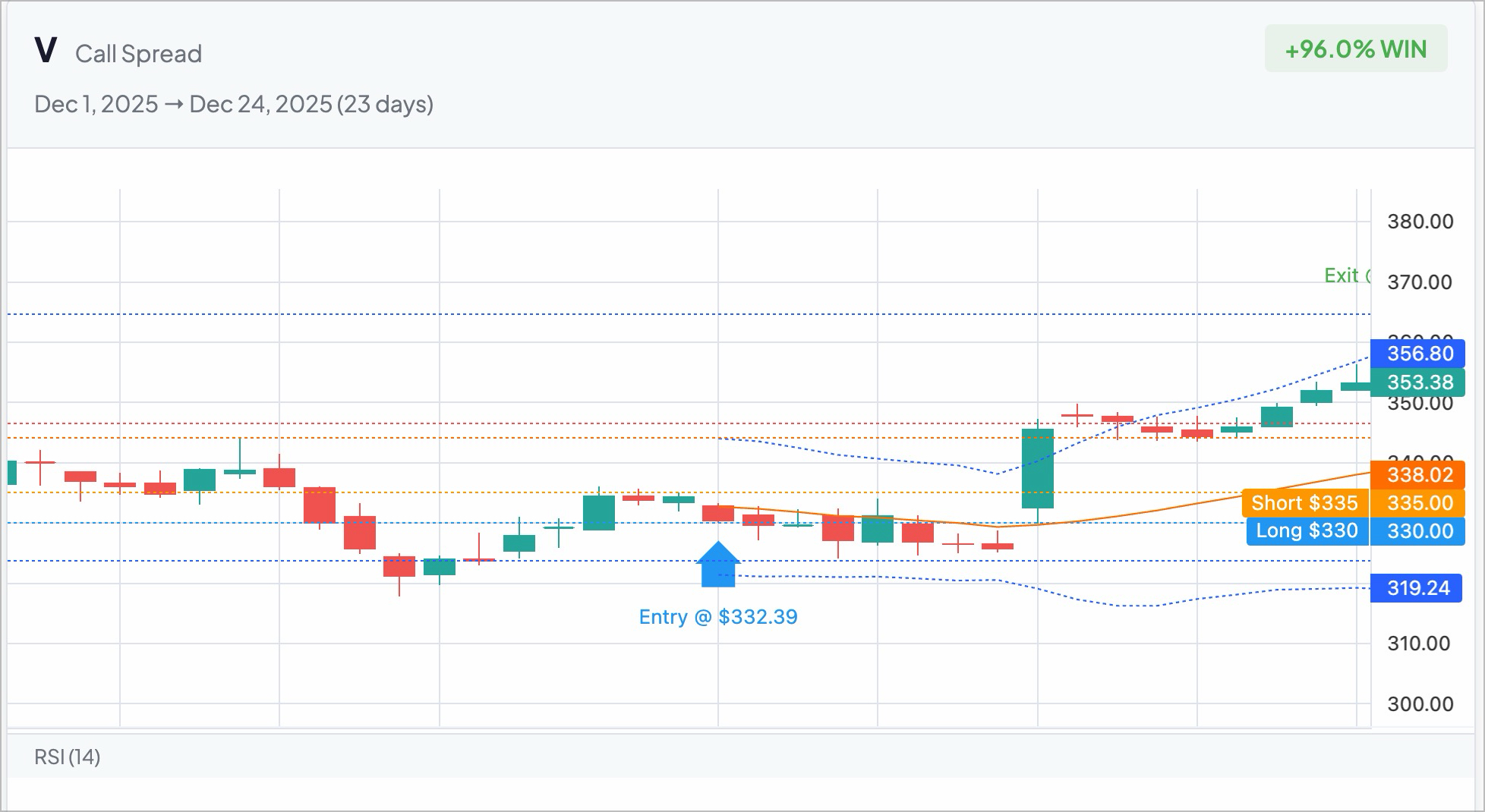On December 1, 2025, Maya identified a compelling opportunity with V, setting her sights on a call spread positioned between the $330 and $335 strikes. The stock had recently shown signs of stabilization, and the technical indicators aligned favorably, persuading Maya to act decisively. With an entry price of $332.39, Maya initiated this trade with a clear target and a robust risk management strategy in place.